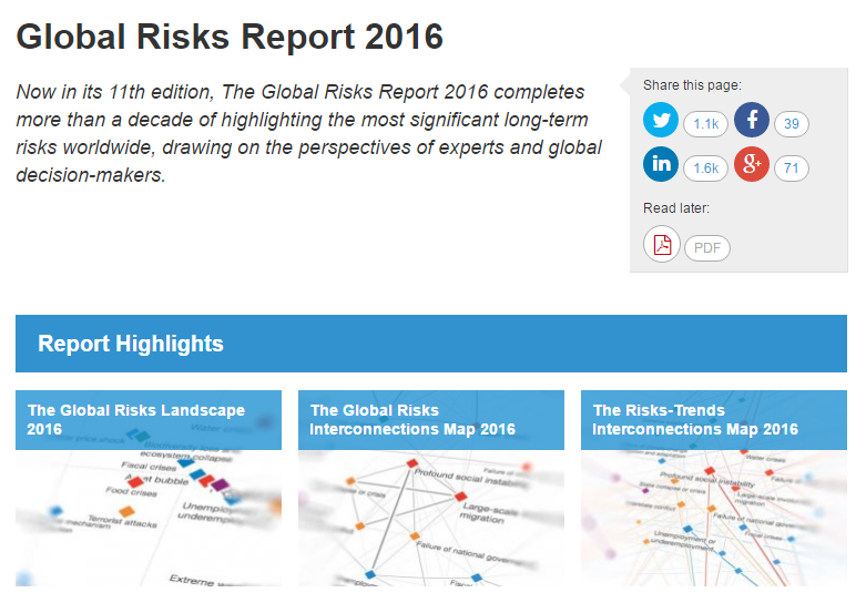 Now in its 11th edition, The Global Risks Report 2016 draws attention to ways that global risks could evolve and interact in the next decade. The year 2016 marks a forceful departure from past findings, as the risks about which the Report has been warning over the past decade are starting to manifest themselves in new, sometimes unexpected ways and harm people, institutions and economies. Warming climate is likely to raise this year’s temperature to 1° Celsius above the pre-industrial era, 60 million people, equivalent to the world’s 24th largest country and largest number in history, are forcibly displaced, and crimes in cyberspace costs the global economy an estimated US$445 billion, higher than many economies’ national incomes. In this context, the Report calls for action to build resilience – the “resilience imperative” – and identifies practical examples of how it could be done.